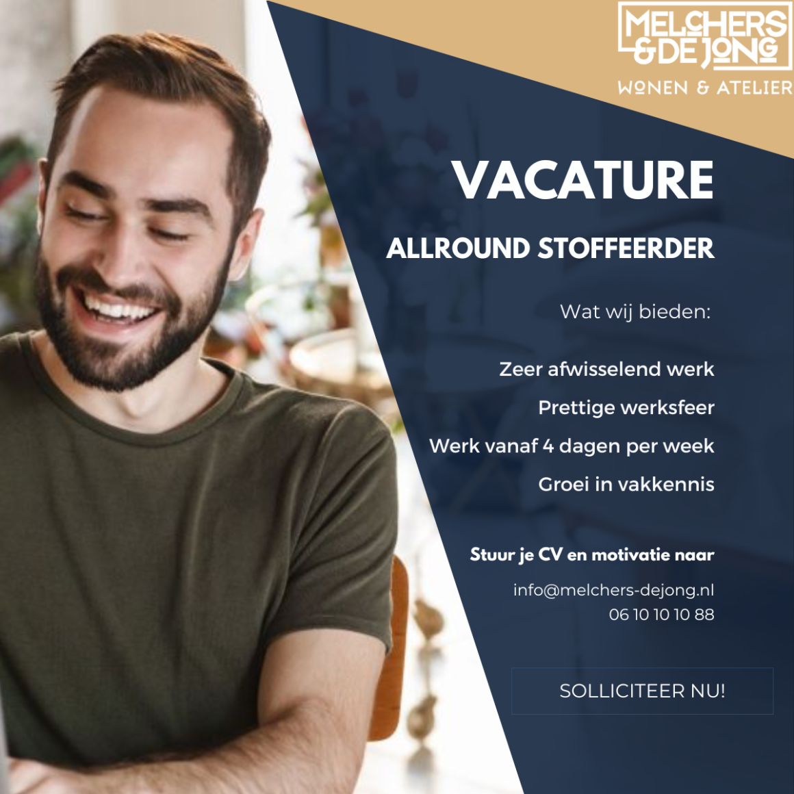 Wij zoeken een stoffeerder in de ruimste zin van het woord. Bij ons leg je niet alleen vloeren, maar werk je ook aan het stofferen van boten, het ophangen van zonneschermen en allerlei andere projecten op het gebied van woningdecoratie.